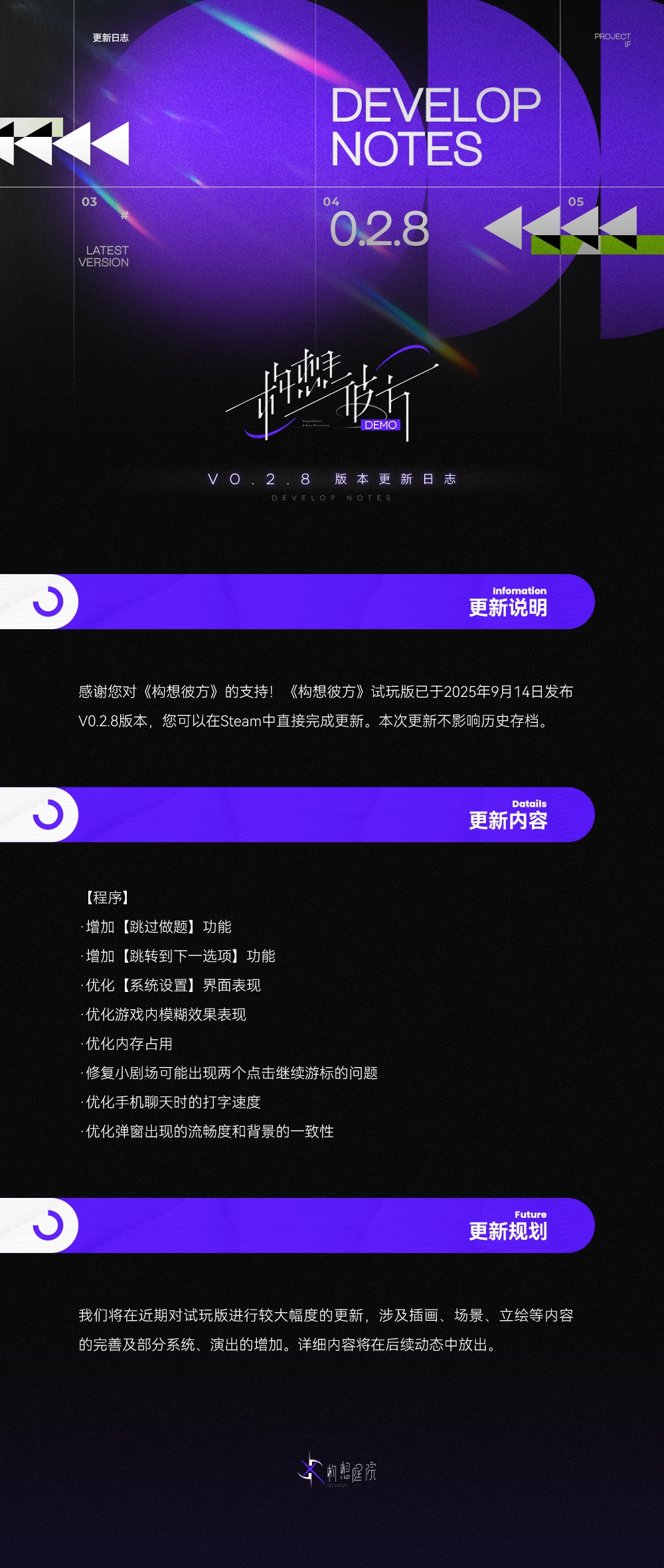 《构想彼方》试玩版V0.2.8已于2025年9月14日更新。更新内容如下: