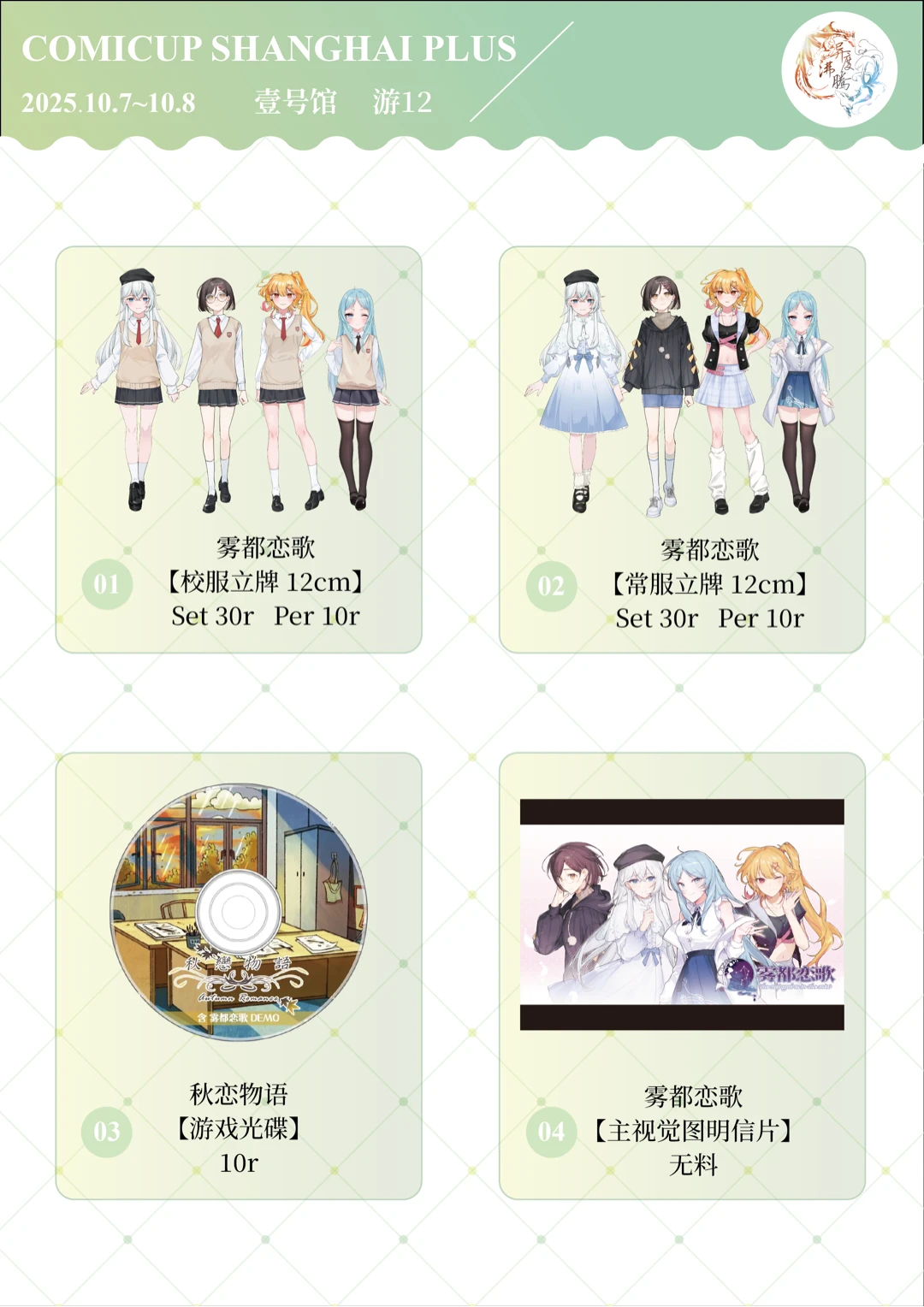 本次摊位上有社团游戏部原创游戏秋恋物语和雾都恋歌(demo)的实体DVD和周边,以及各位社员的制品。