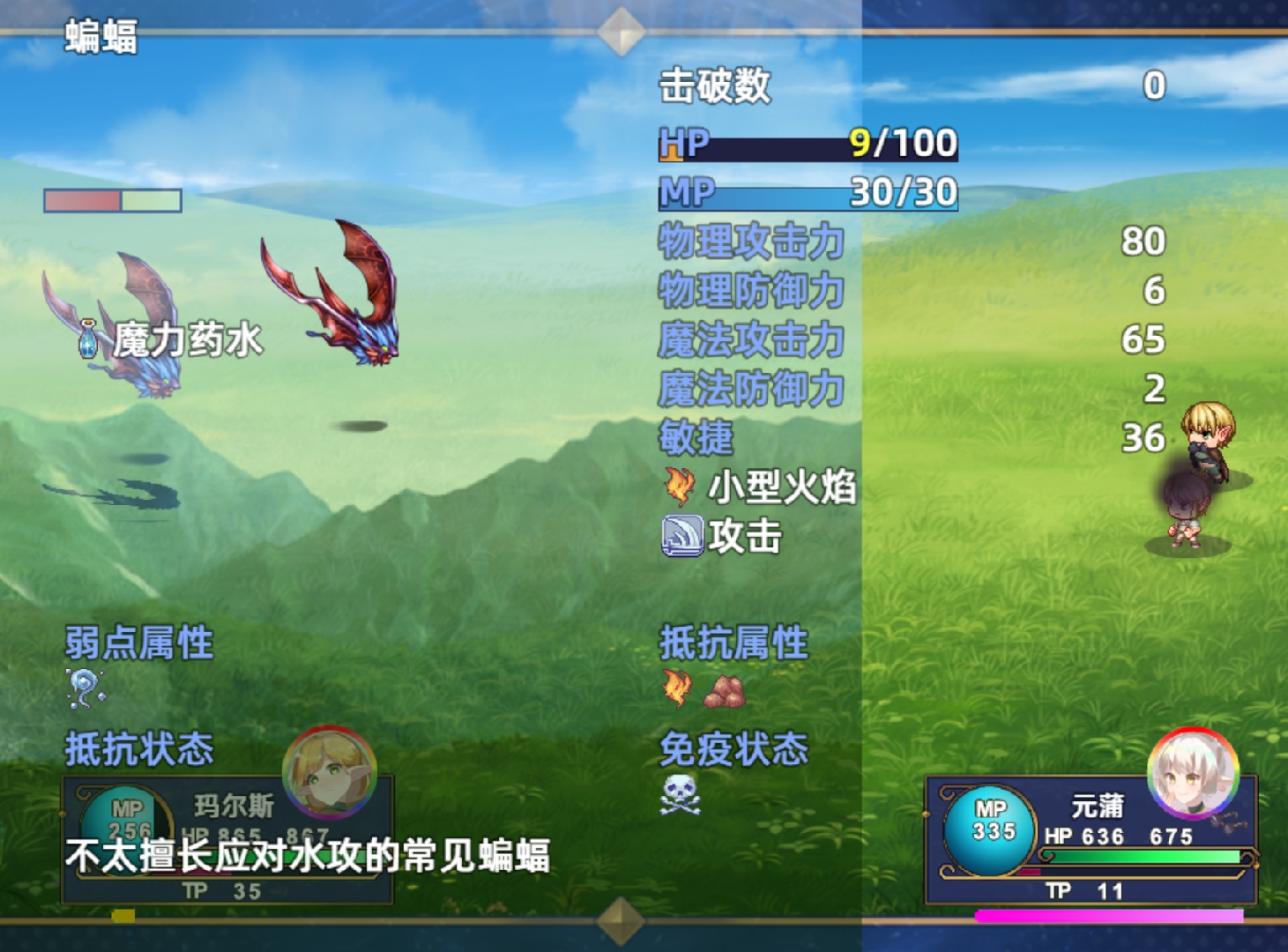 ⑥提升部分耗MP技能如小型火焰、热风、烈热风、圣光、魔法闪耀、暗影球、暗之波动、五蛟灭世的技能威力。为元蒲增加了可以在战斗中查看敌人一般状态、抵抗及弱点属性的技能——博识之眼。