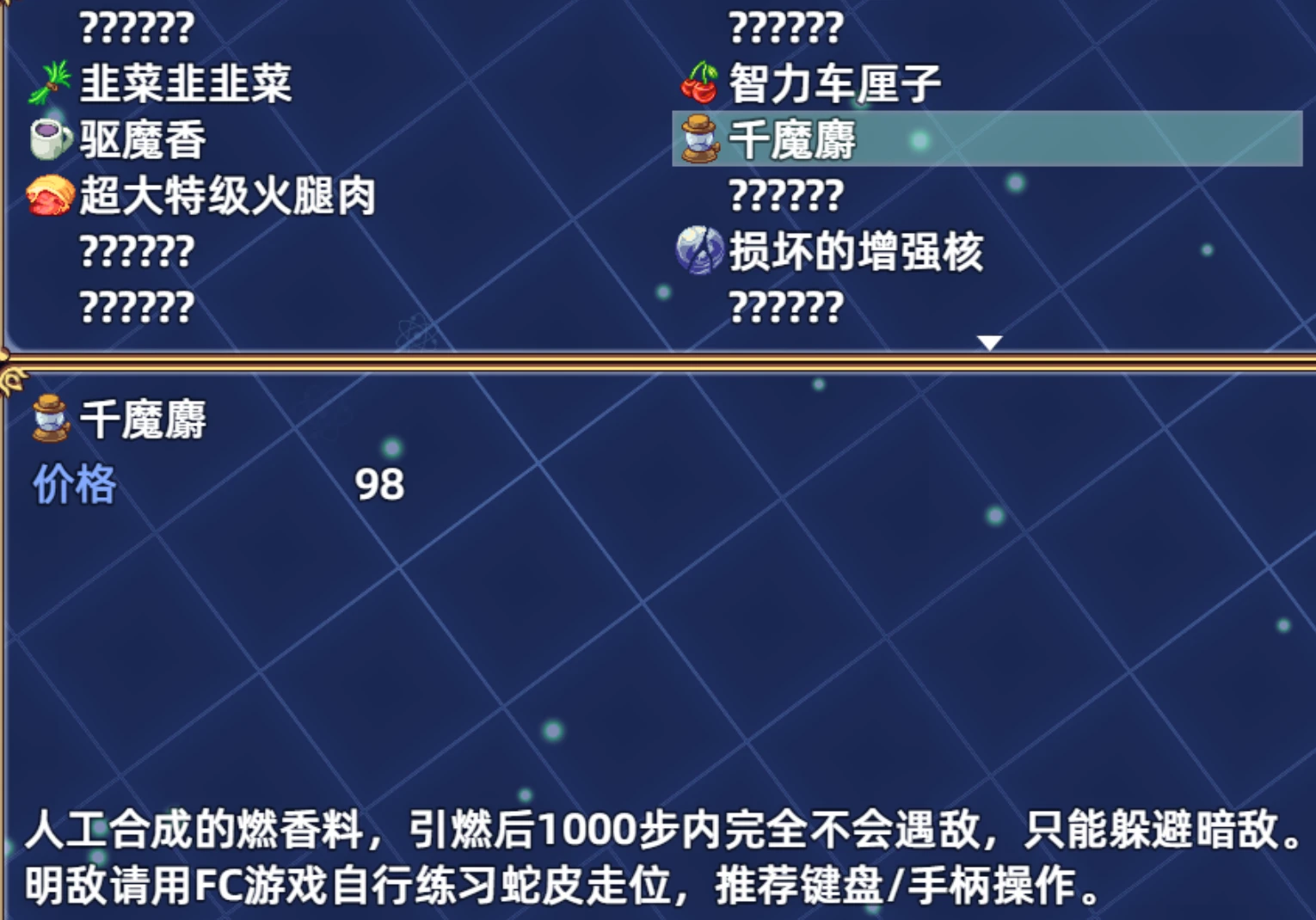 ①降低了世界地图、迷失森林等地图暗雷遇敌率。增加十里香暗雷遇敌减半、驱魔香避免暗雷的持续步数。增加合成道具千魔麝,1000步内完全不会遭遇暗敌,可在农谷山庄-商店、主城右上角卖货老人旁调查魔药锅、合成机合成。