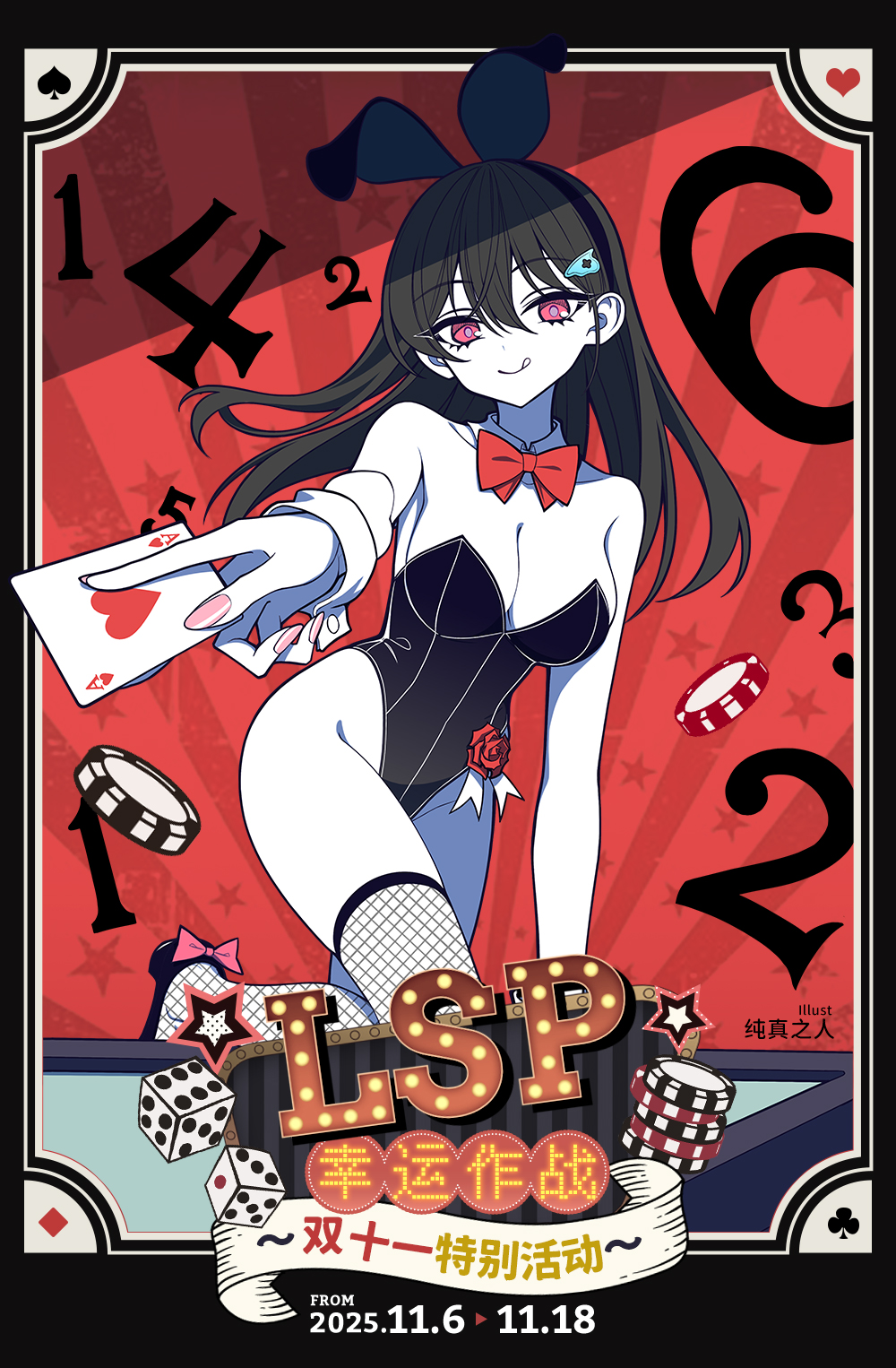 今年双十一,我们搞了个有点刺激的爆金币活动!11月6日 - 11月18日,看板娘化身性感的兔女郎荷官为您在线发牌。客官的LSPID,究竟是几级幸运呢?