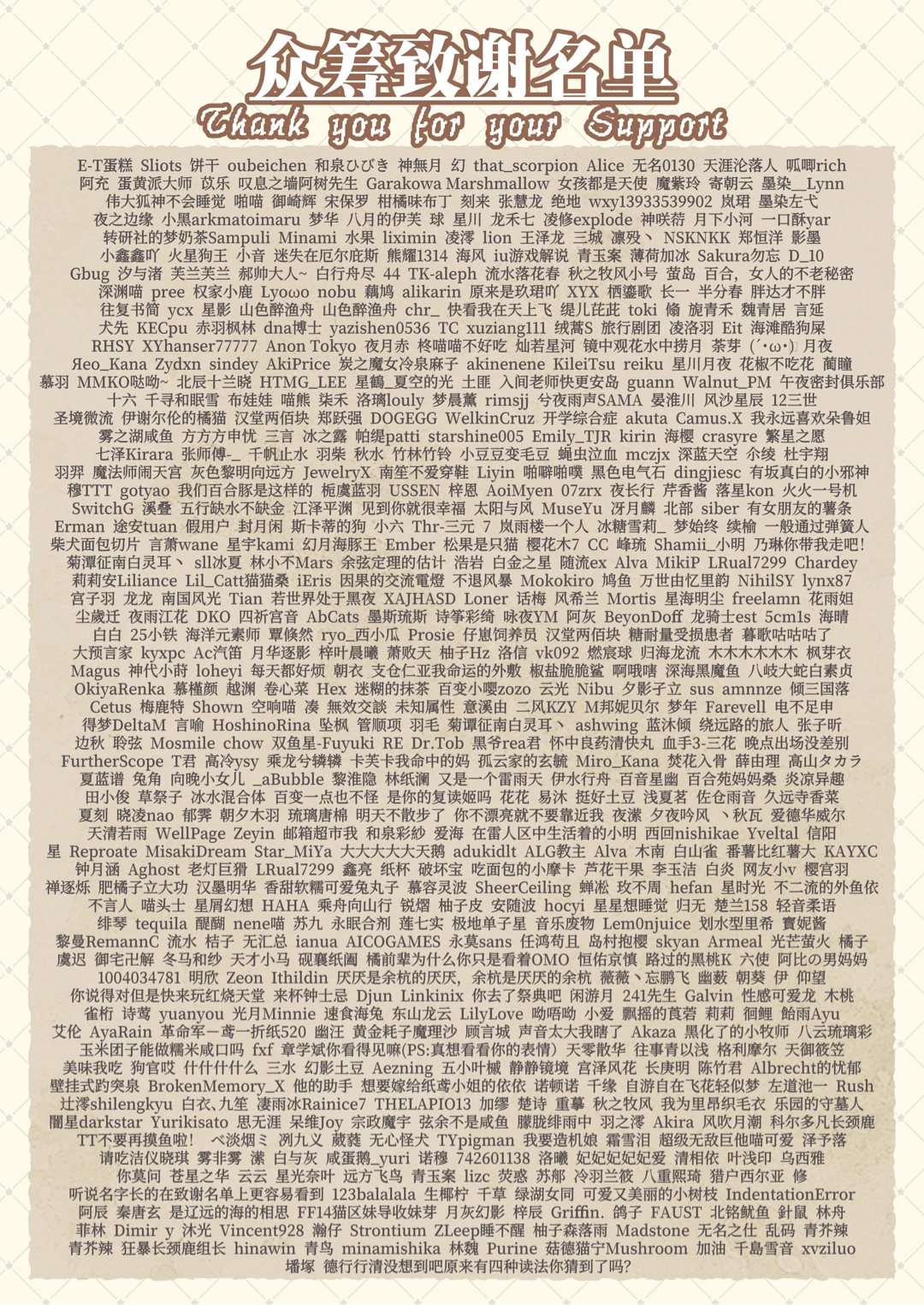 所有参加摩点众筹的各位支持者们可以在游戏片尾曲里看见自己的名字~