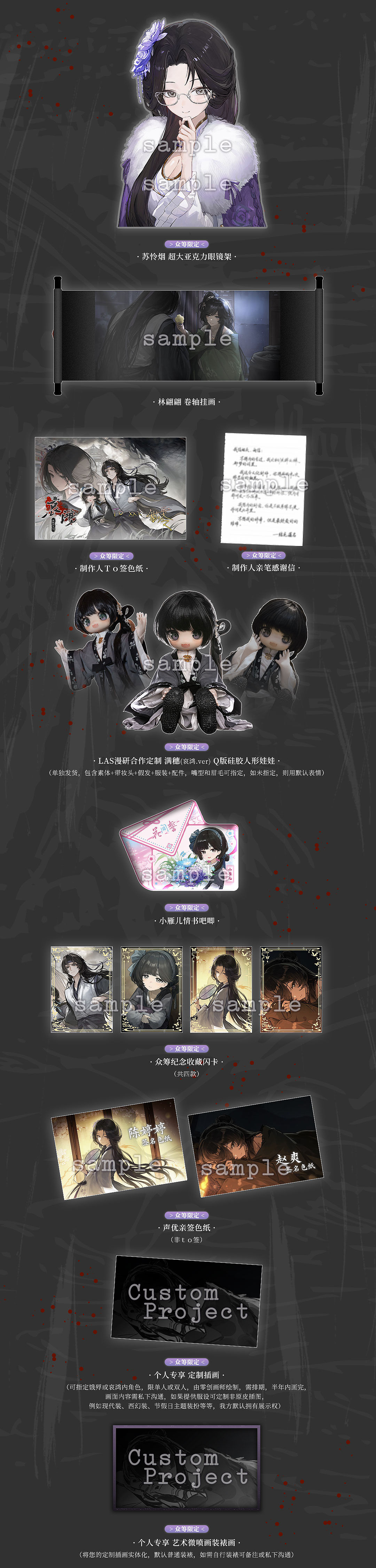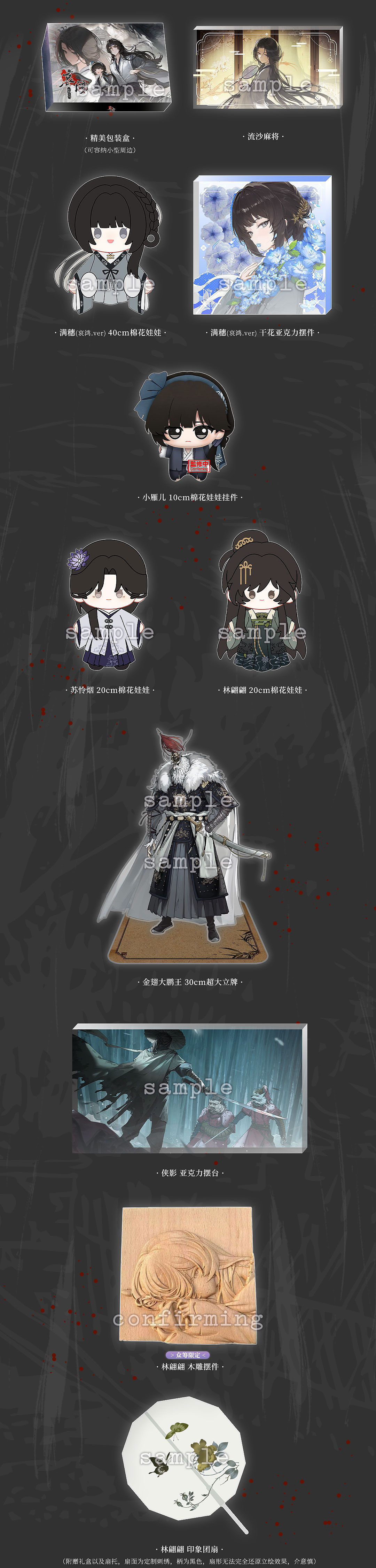 此次我们还准备了许多新的周边款式,除了常规的吧唧、立牌、镭射票外,还有屏风色纸、木雕摆件、棉花娃娃、Q版硅胶娃娃(超大超重超可爱的哦!)等。