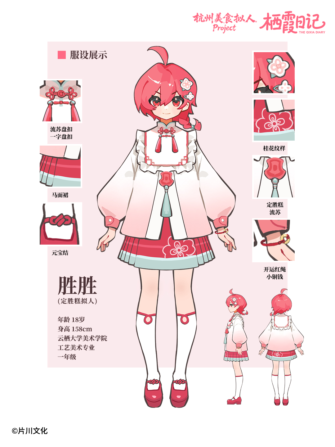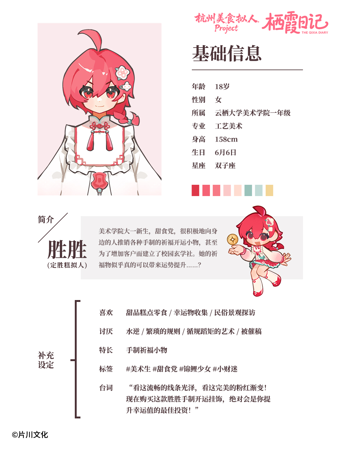 胜胜——幸运锦鲤定胜糕:本作的女主人公,云栖大学工艺美术系大一新生。普普通通地憧憬着大学生活,普普通通地有着擅长和不擅长。不过,在这“普通”之下——她可是有着小小的不同寻常?虽然有点冒冒失失,但也请多多指教啦!