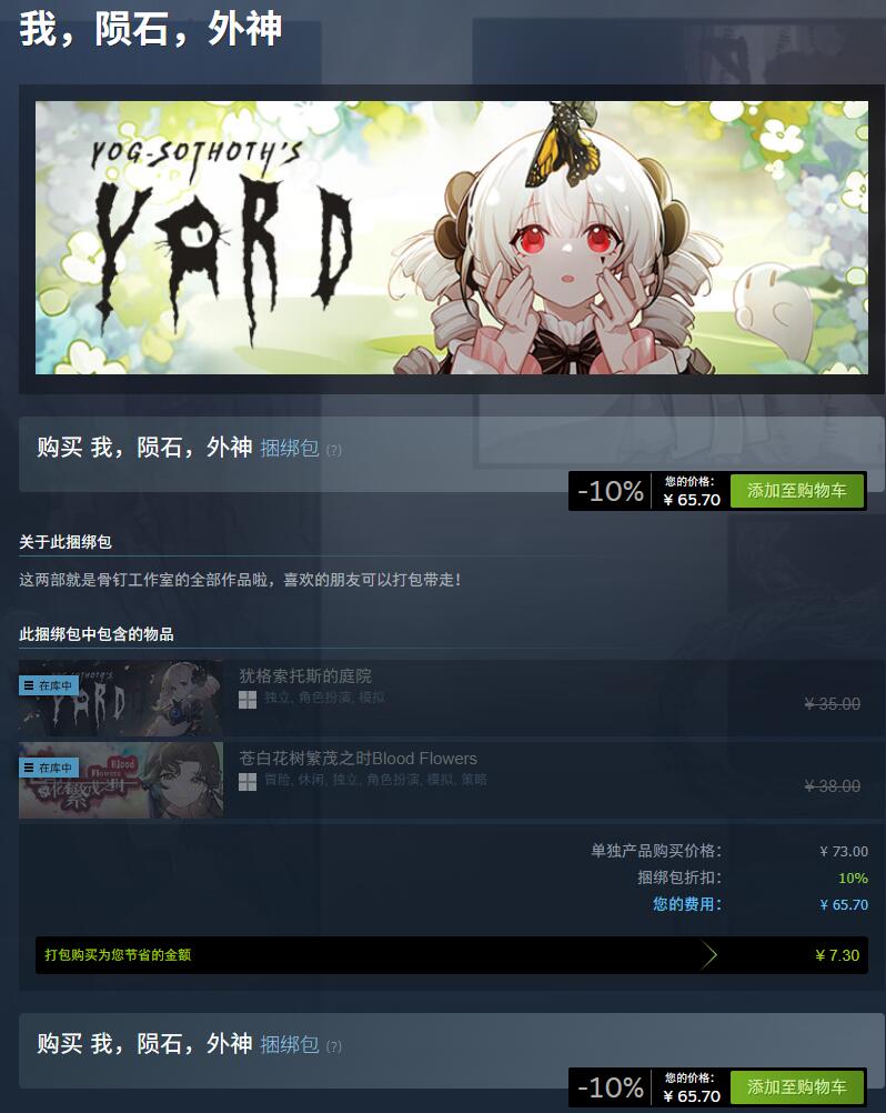 马上春节了,骨钉工作室的三款产品即将开启新春折扣。《苍白花树繁茂之时》《犹格索托斯的庭院》《死神模拟器》三款游戏全部打折,折扣平史低,折扣时间是2月13——2月27,马上还有3天,想买还没有买的可以做个等等党。