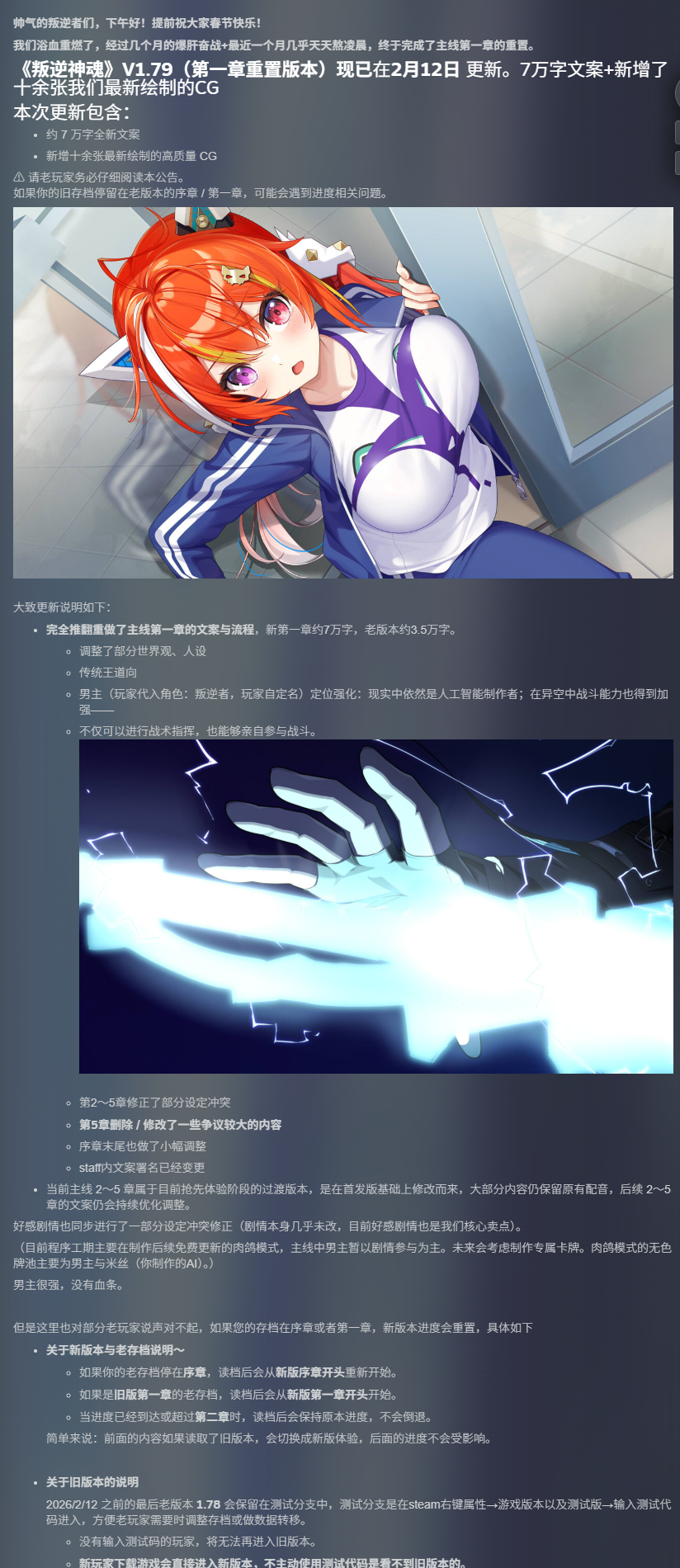 第一章推翻重做了,更新大版本1.79,详见steam公告 ,小神立绘正面脸部也已修改