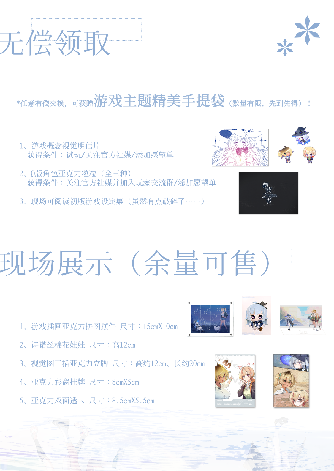 ✦现场周边&无料领取见p10p11以及cpp上可以看到部分实物图,无料数量有限,赠完即止同时在现场还可以阅读我们的早期设定集(已经有点破损了……)。