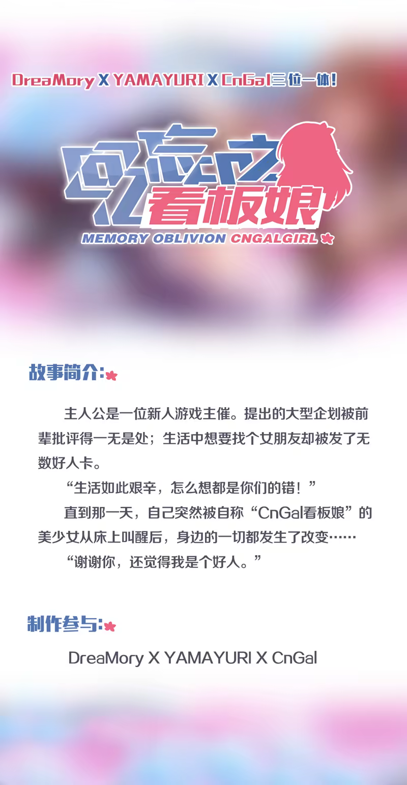 作品讲述的是一个温暖人心的治愈系励志故事,作品中带入了不少关于CnGal看板娘的日常梗以及国产galgame相关的梗,希望大家喜欢这个短篇,喜欢上我们的看板娘。