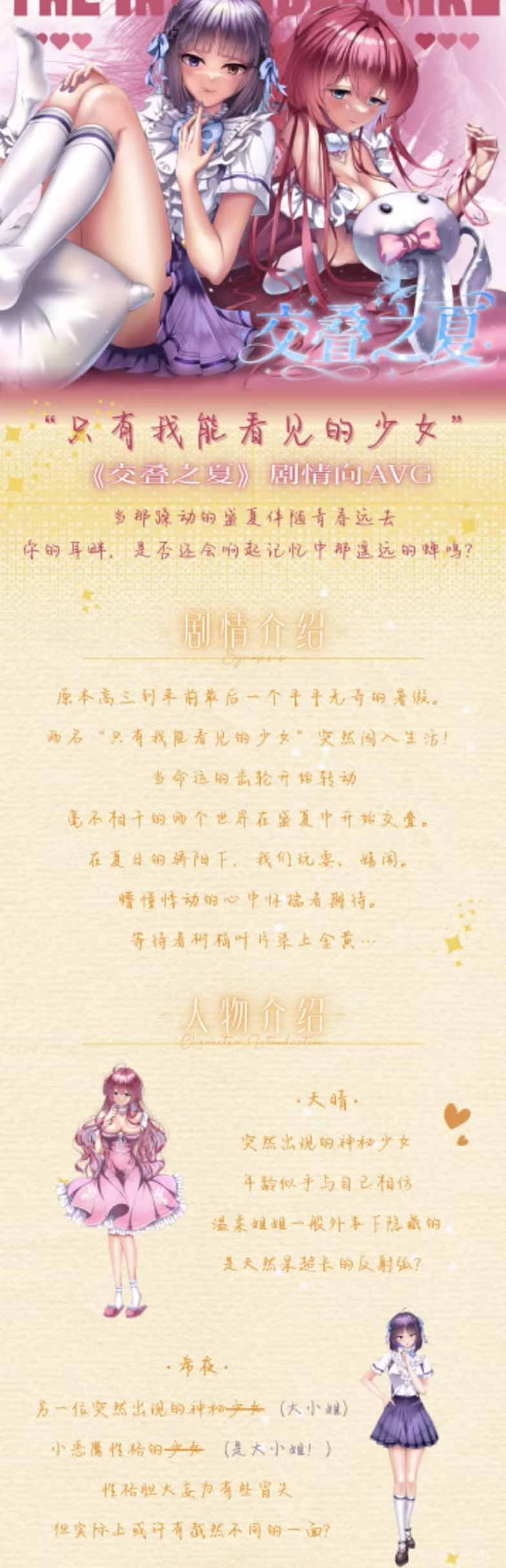 《交叠之夏》是联结互动工作室开发的视觉小说游戏,玩家将扮演一名高中生,夏天在此重叠,讲述了一件关于不同世界线,救赎与恋爱的美好故事
